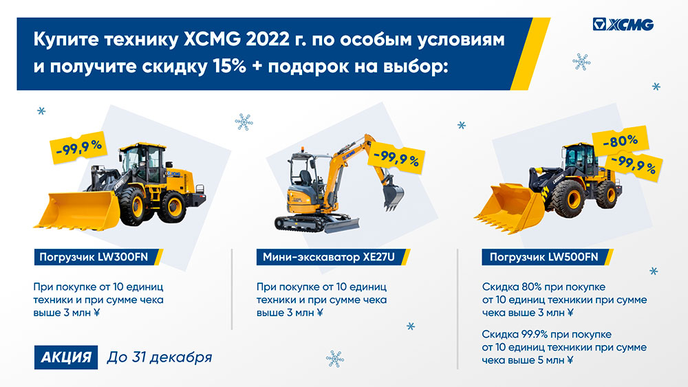 | Техника XCMG 2022 года выпуска, в наличии на складах РФ | При покупке от 10 единиц любой техники XCMG и на сумму более 3 млн. юаней действует скидка 15%, а также покупатель может выбрать один подарок | 15% |